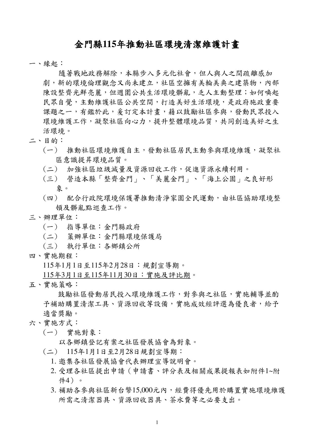 (一)補助依據(金門縣政府環境保護局金門縣115年推動社區環境清潔維護計畫)