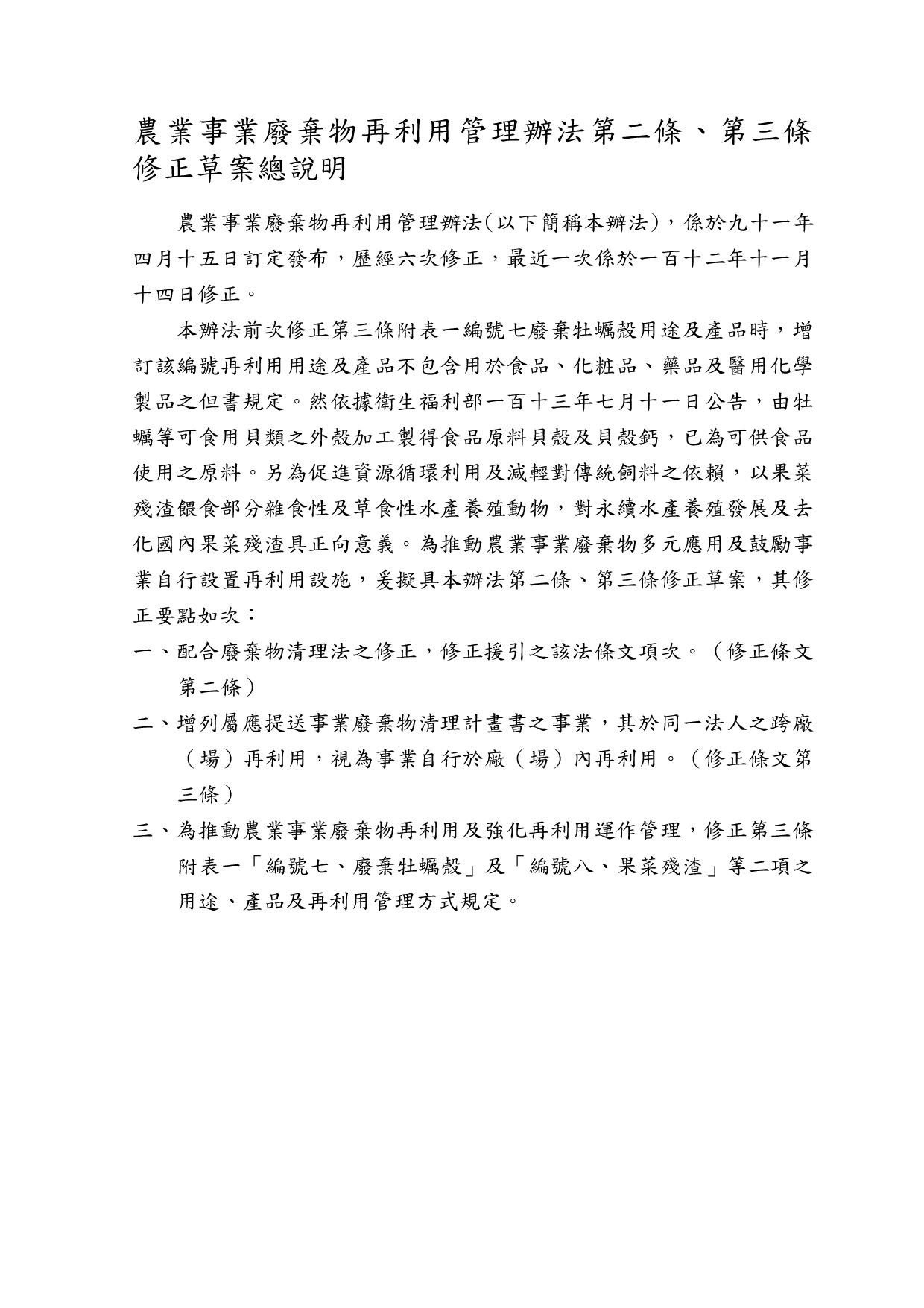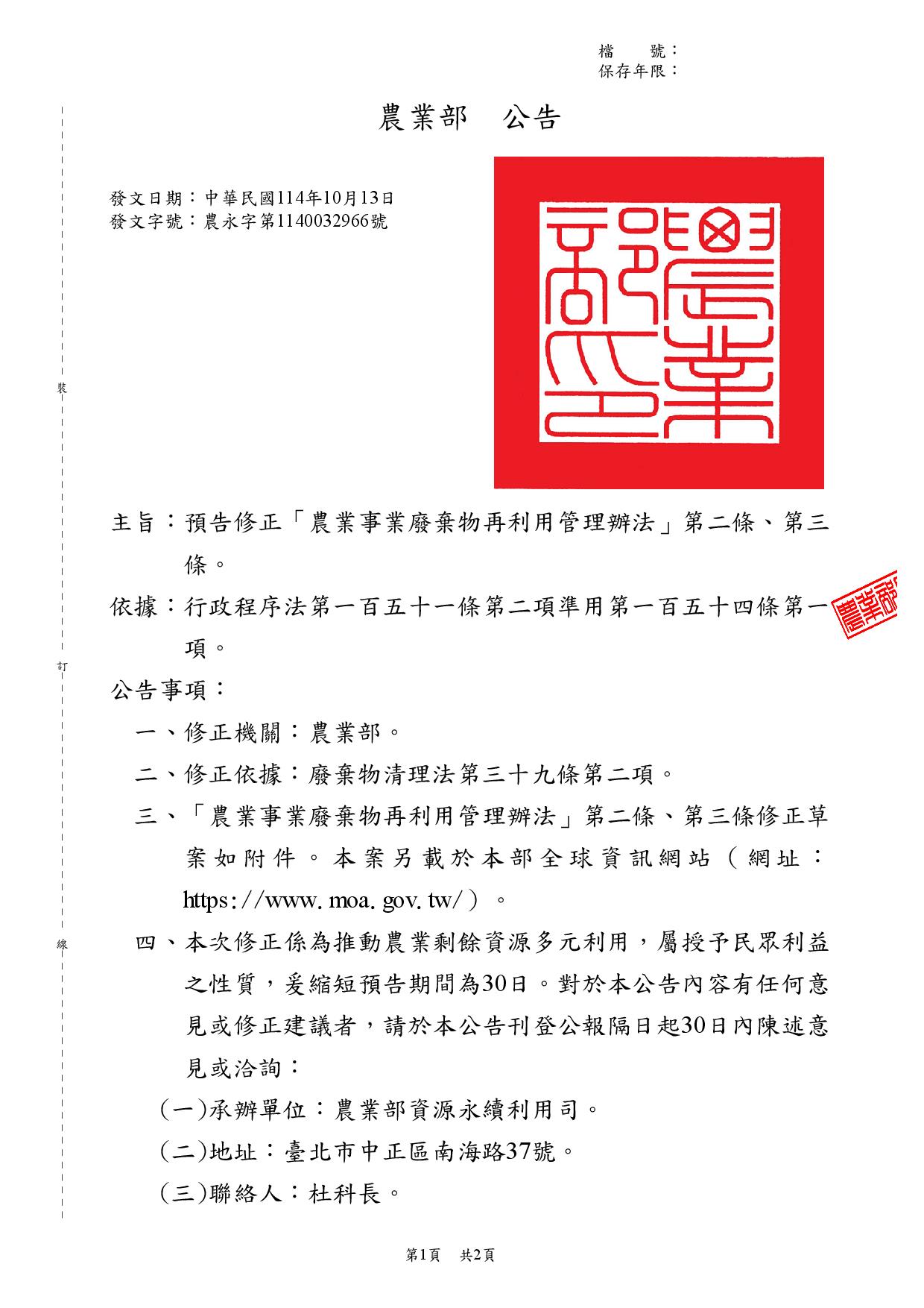 農業部公告「農業事業廢棄物再利用管理辦法」第2條、第3條修正草案,對於本公告內容有任何意見或修正建議者,請於本公告刊登公報隔日起30日內陳述意見或洽詢農業部資源永續利用司