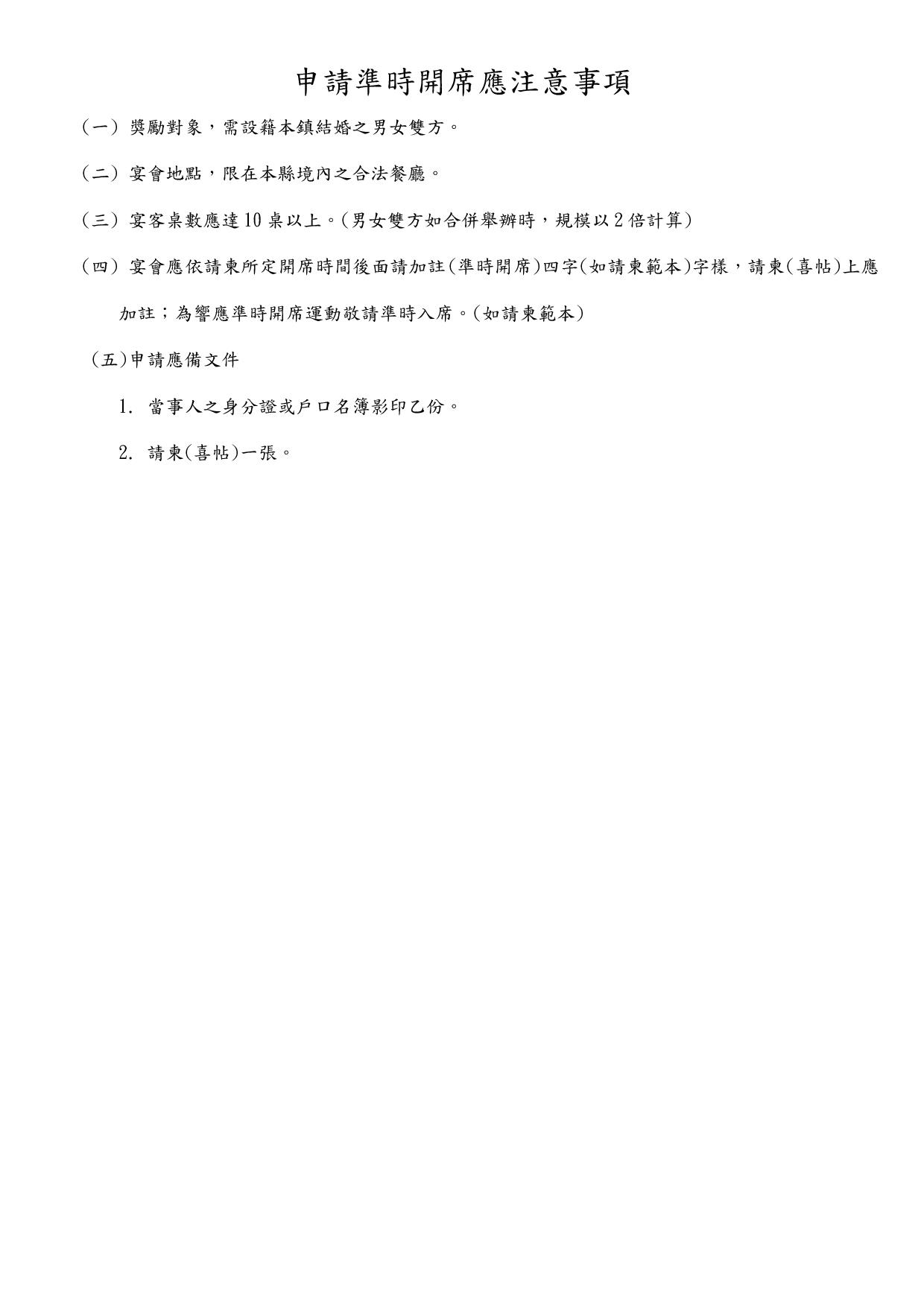 (三) 宴客桌數應達10桌以上。(男女雙方如合併舉辦時,規模以2倍計算)