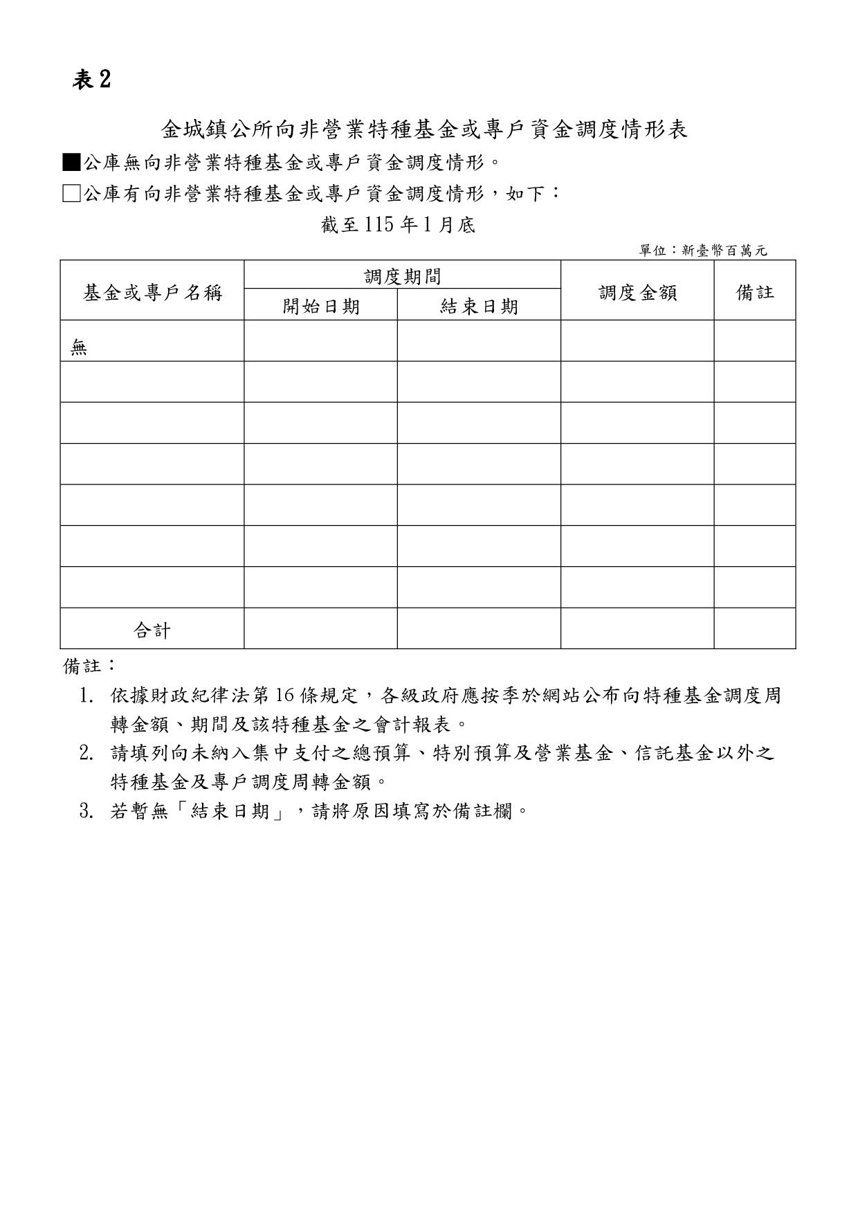 向非營業特種基金或專戶資金調度情形表。
